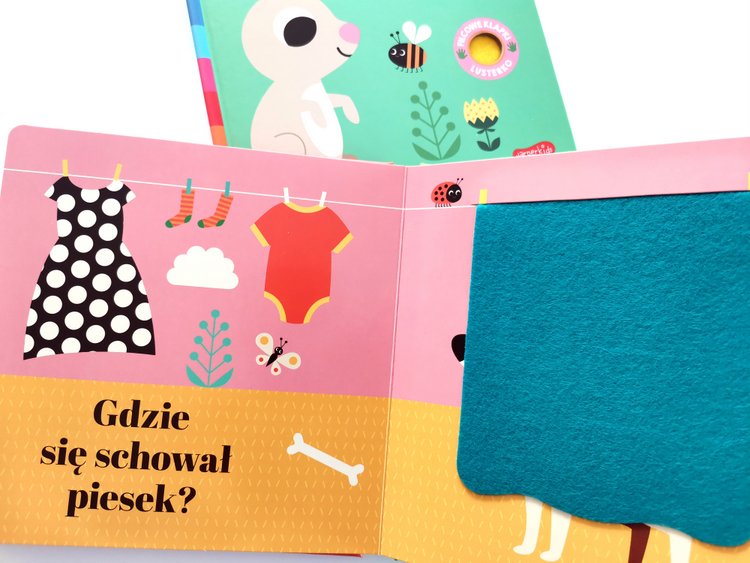 Bawiąc się książeczkami Okruszek będzie szukał uroczych zwierzątek pod filcowymi klapkami. Maluszek będzie przewracać strony, otwierać klapki i zaglądać do kryjówek, aż na samym końcu odnajdzie samego siebie i przejrzy się w lusterku. ???