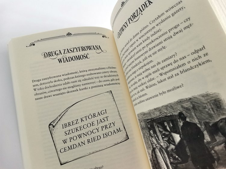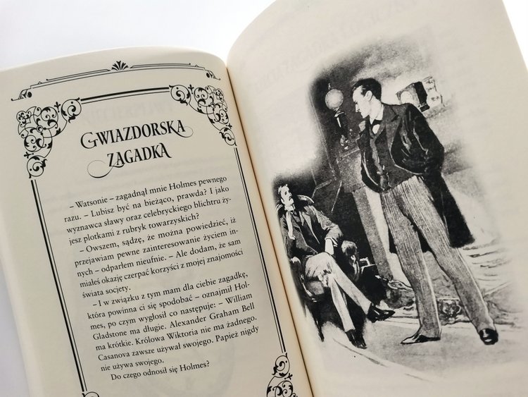 To książka odpowiednia dla dzieci powyżej 15 roku życia. W jej środku znajdziemy wiele zagadek do rozwiązania, czarno – białe ilustracje oraz 2 opowiadania należące do klasycznej serii przygód Sherlocka Holmesa: „Sprawa dziedziców z Reigate” oraz „Rytuał Musgrave’ów”, które Arthur Conan Doyle uważał za jedne z najlepszych w swoim dorobku. 😍😍😍