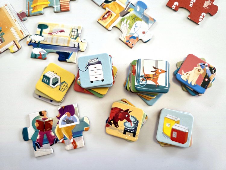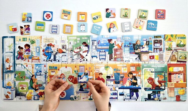 W środku pudełka znajdziemy poziome 60 – elementowe puzzle, plakat edukacyjny z licznymi informacjami i ciekawostkami oraz 32 kartonowe obrazki do dokładania w odpowiednie miejsca. Puzzle zachęcają Okruszka do zabawy i nauki, a dokładane elementy i śliczne kolorowe ilustracje przyciągają wzrok i sprawiają, że zabawa staje się jeszcze bardziej ciekawsza. Dzięki temu zestawowi przedszkolak wyruszy na edukacyjną wyprawę do przychodni weterynaryjnej. 😍😍😍