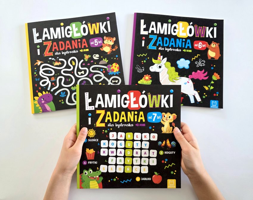 ŁAMIGŁÓWKI to quizy i różne łamigłówki z naklejkami, m. in.: labirynty, dopisywanie brakujących liter, łączenie cyfrowych kropek, rysowanie, kolorowanie obrazka według numerów, znajdywanie różnic, wybieranie identycznych rysunków, rozpoznawanie kształtów, łączenie przedmiotów z ich cieniami oraz odnajdywanie wyrazów w literowej rozsypance, itp. oraz książki z zagadkami dla dzieci w formie pytań i rymowanych wierszyków.